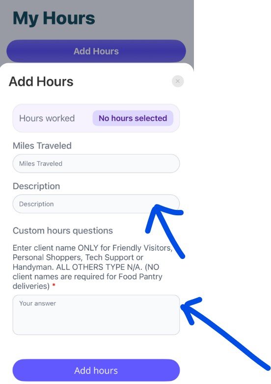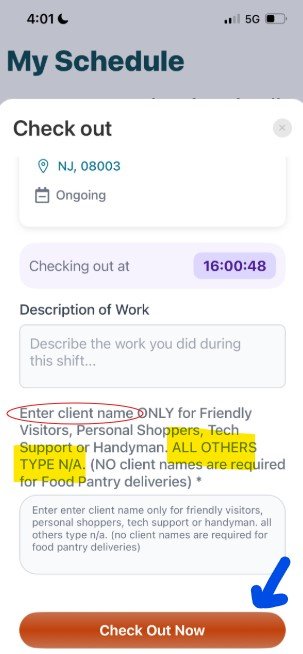 6. If required, enter a client name. (Only for Friendly Visitor, Personal Shopper, Tech Support, or Handyman volunteers—otherwise, type "N/A.")