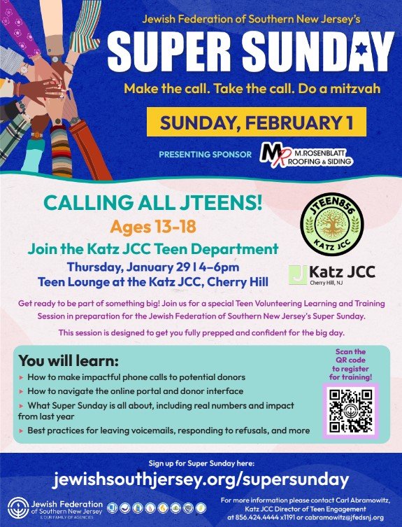 The Katz JCC is inviting all JTeens (13+, but some exceptions can be made; contact Carl Abramowitz) to join the Katz JCC Teen Department for a Volunteering and Training Session on Thursday, January 29 from 4:00–6:00 PM in the Teen Lounge, in preparation for Super Sunday on Sunday, February 1.