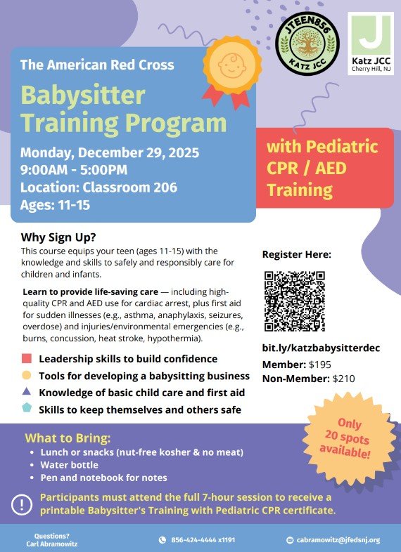 The Katz JCC is hosting the popular certification class , American Red Cross Babysitters Training + Pediatric CPR/AED, it is happening over winter break and is already half full.